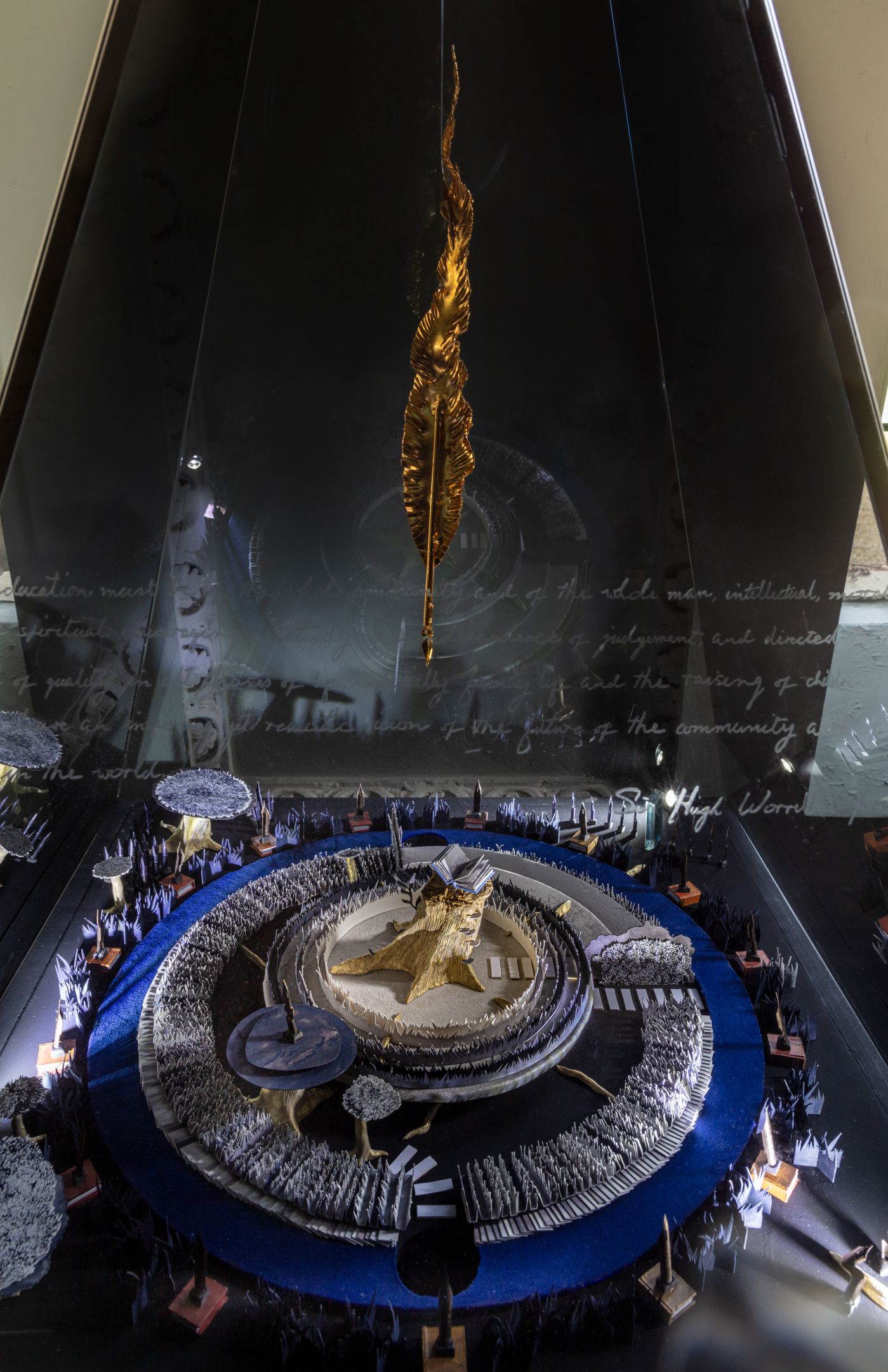 The statue is further contextualised by digital displays in the ante-room of the Library, through which users pass. Currently there are three presentations: